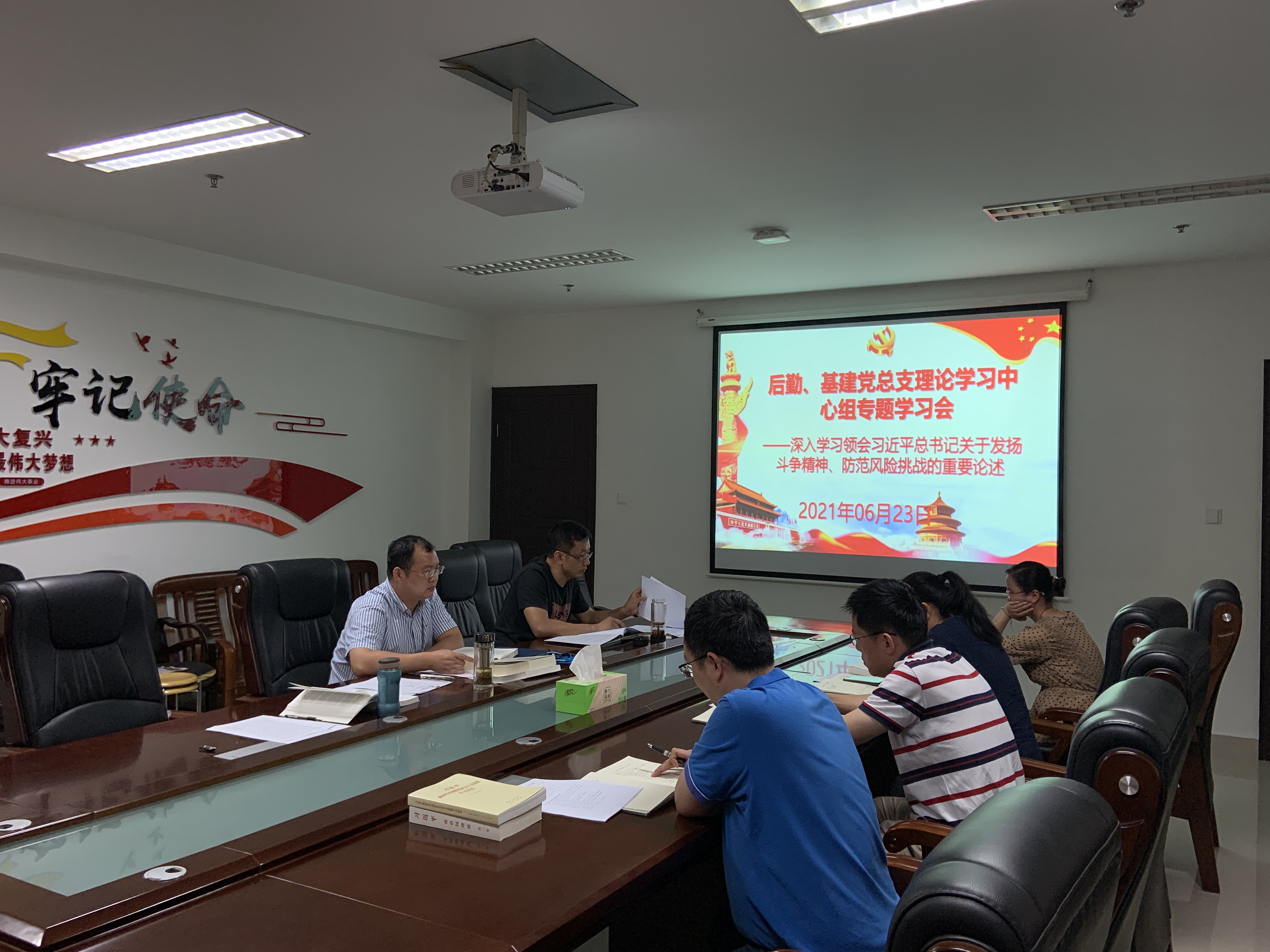 6月23日,后勤、基建党总支理论学习中心组在仙林校区学生事务服务中心四楼409会议室,专题学习习近平总书记关于发扬斗争精神、防范风险挑战的重要论述。后勤、基建党总支理论学习中心组成员参加会议,会议由党总支书记郭彦铮主持。