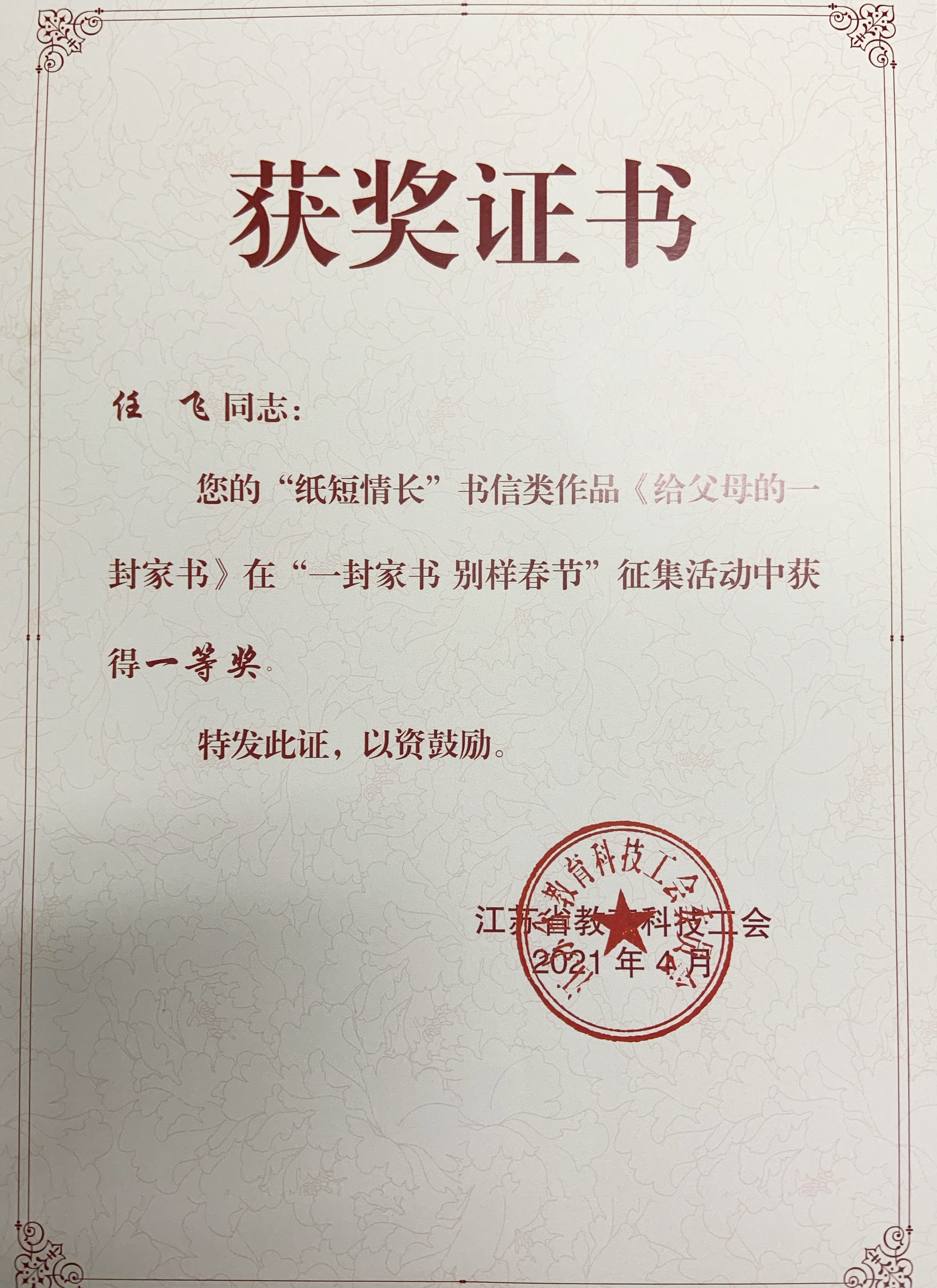 日前,江苏省教育科技工会开展的“一封家书 别样春节”征集活动评选结果揭晓,南京邮电大学后勤、基建分工会选送的“纸短情长”——“一封家书寄相思”《给父母的一封家书》(作者:任飞)获书信类作品一等奖。