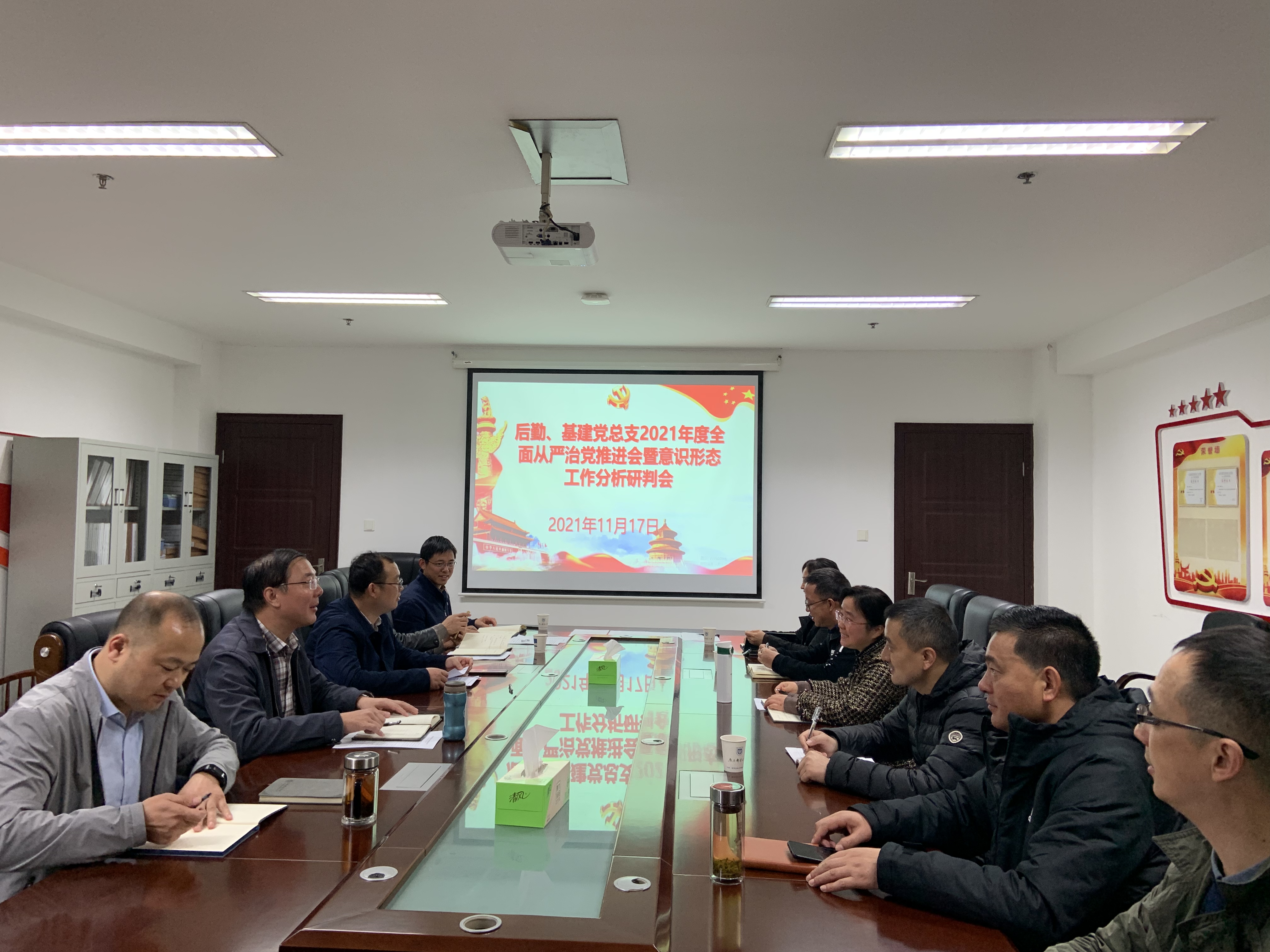 11月17日下午,后勤、基建党总支在仙林校区学生事务服务中心409会议室召开2021年全面从严治党推进会暨第四季度意识形态工作分析研判会。党总支领导班子成员、党支部书记、科职干部、党风联络员、特邀监察员参加会议,会议由党总支书记郭彦铮主持。