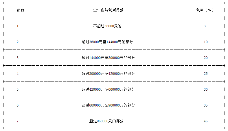 注2:非居民个人取得工资、薪金所得,劳务报酬所得,稿酬所得和特许权使用费所得,依照本表按月换算后计算应纳税额。)